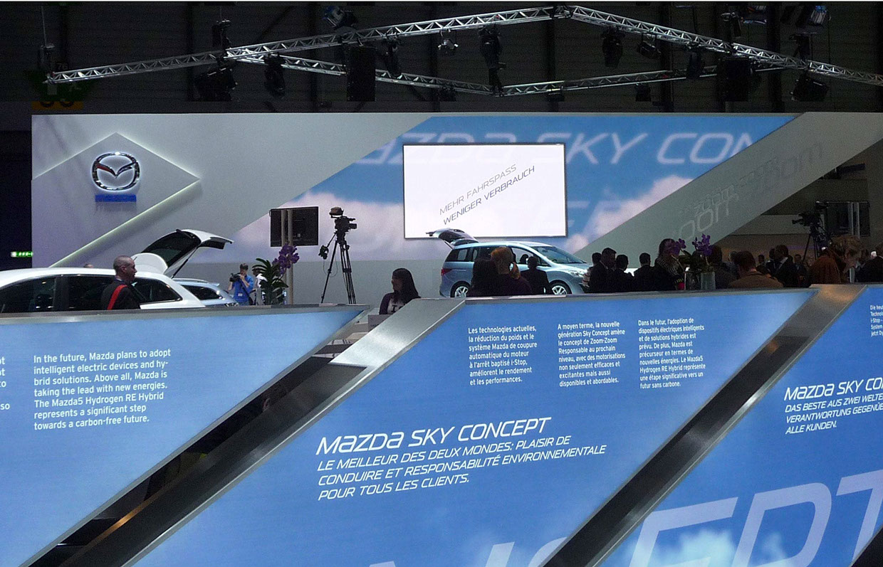 Visuals, Animationen und technische Erklärfilme in diversen Sprachen für einen Marathon an Automobilausstellungen (IAA, Autosalon Genf, etc) für den neuen Mazda 5, Mazda 6 und Mazda MX5. Im Fokus stand zudem das neue Mazda Sky Concept. Der Hauptscreen (Motionwall) ist aus zwei Screens kombiniert. Auf diesen laufen synchronisiert ca. 2-4 minütige Animationen. Über die gesamte Ausstellungsfläche verteilt informieren unterschiedlich große Displays mit themenbezogenen Animationen über z.B. C02-Emissionen, Verbrauch und alternative Antriebsmöglichkeiten oder die allgemeinen Vorteile der neuen Mazda-Generation.