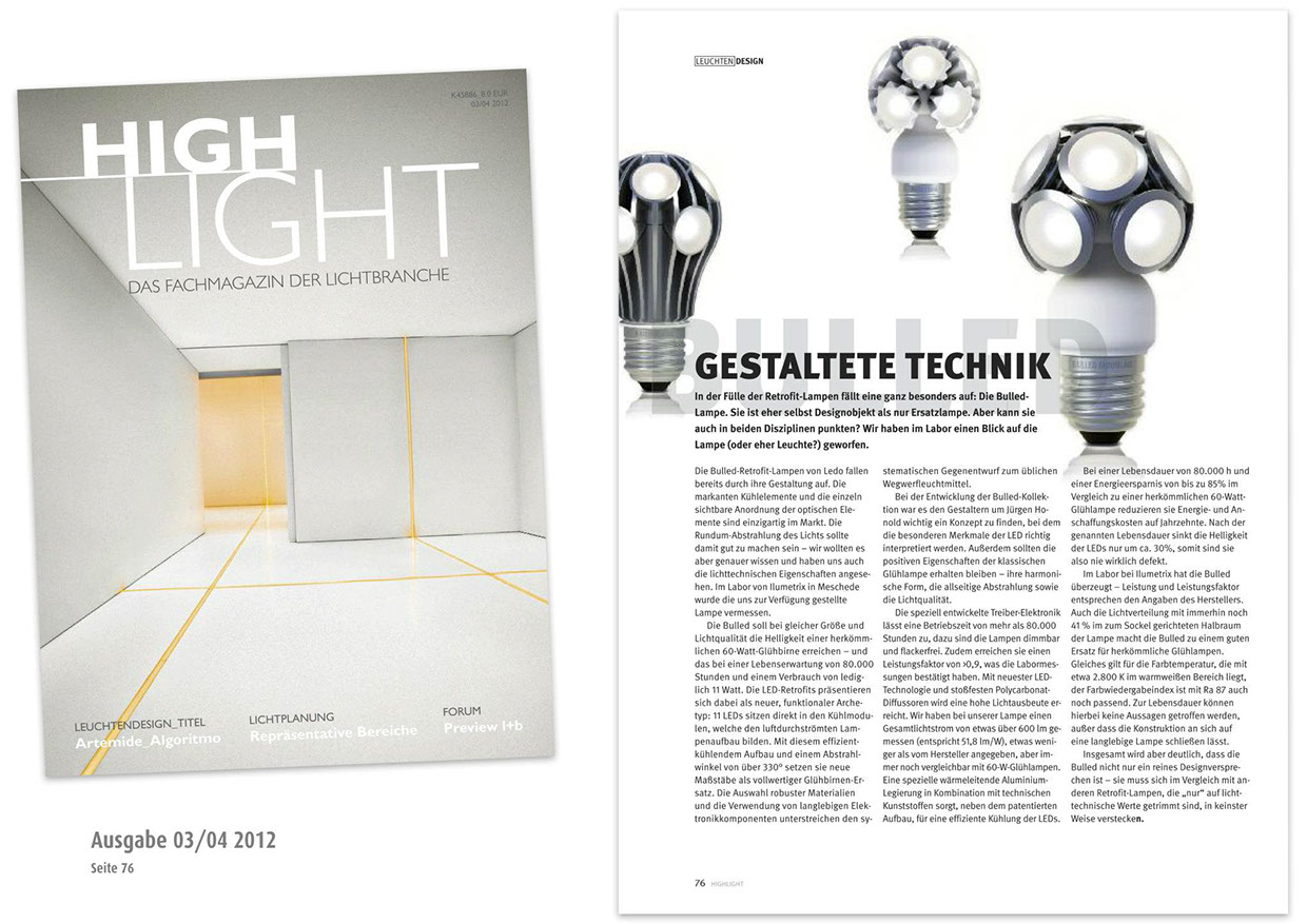 RLDSGN plante und organisierte zudem die Messestände für die EUROLUCE in Mailand und light+building in Frankfurt und ist für die gesamte Presse- und Öffentlichkeitsarbeit sowie die Teilnahme an den bekannten Designpreisen zuständig. LEDO BULLEDs wurden vielfach nominiert.