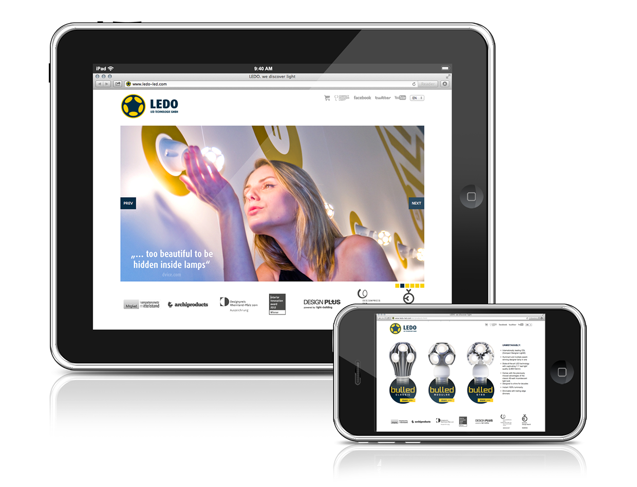 Job: Für die Firma LEDO LED Technologie GmbH aus Mainz entwickelt und betreut RLDSGN das komplette Kommunikationspaket. Angefangen bei Corporate Identity, also Logos für Firma und Produkte inklusive Entwicklung von Styleguides für das gesamte Corporate Design, sowie Gestaltung und Produktion von Geschäftsunterlagen (Briefpapier, Visitenkarten, Imagebroschüren, Produktflyer) Verpackungen und Umverpackungen der Produkte abgestimmt auf nationale und internationale logistische Prozesse, Pressemitteilungen, Bedienungsanleitungen, Anzeigen in Fachmagazinen, Beschilderung des Firmengebäudes, Beschriftung der Fahrzeugflotte, Displays in Shops, Entwicklung von Musterkoffern für den Vertrieb und Außendienst, Corporate Company Website als auch Produktwebsite, Microsites und Social Media Websites, PowerPoint Präsentationen, etc.